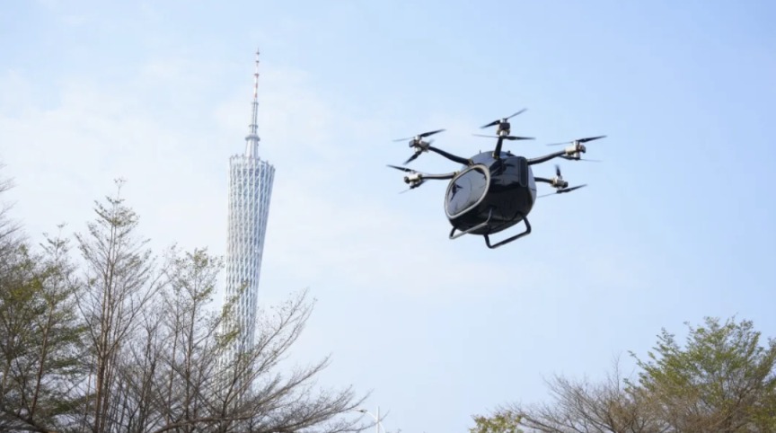 广汽飞行汽车GOVE在广州CBD上空进行飞行展示