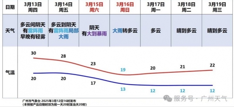 广州市具体天气预报显示为,3月13日至14日,暖湿气流输送加强,天气不稳定,有雷阵雨局部大雨;15日至16日,受冷空气、高空槽和切变线影响,有一次大到暴雨过程,并伴有短时强降水、8-10级短时大风、强雷电和局地冰雹等强对流天气,气温下降,过程降温7-9℃;17日至22日,多云到晴,昼夜温差加大,早晚寒凉。